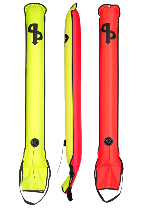 Einfach und wirksam im Gebrauch wird die Boje mit dem Atemregler am offenen Ende aufgeblasen. In der Öffnung sitzt eine Trennwand – oder Rückstromventil – die direkt beim Aufblasen einen luftdichten Verschluss bildet und damit verhindert, dass sich die Boje versehentlich an der Oberfläche entleert.