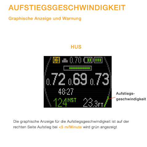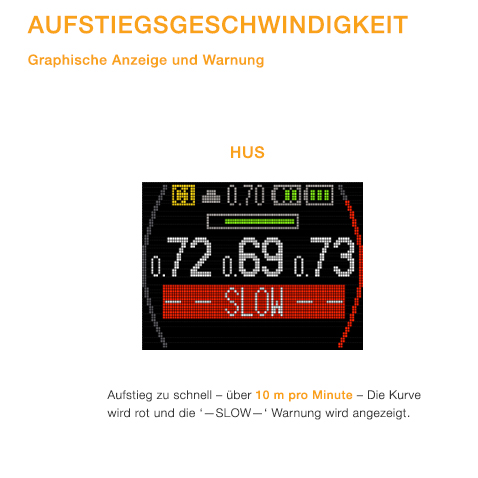 - Die Kurve wird rot, um vor zu schnellem Aufstieg zu warnen und die normale Textwarnung wird angezeigt