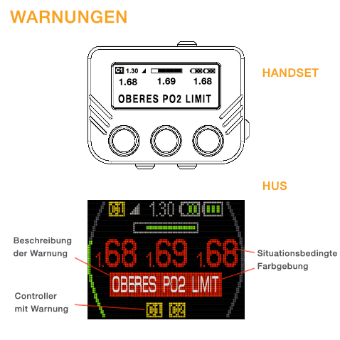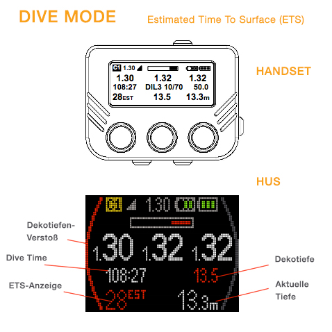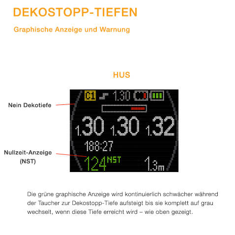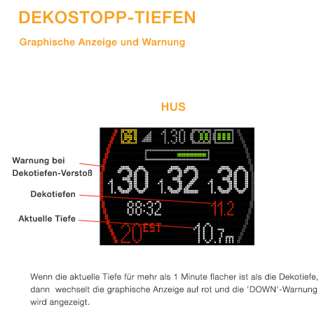 - Sobald Dekopflicht eintritt, werden Informations-Signale/Alarme wie z.B. Time to Surface (TTS) und Dekotiefe in Gelb angezeigt