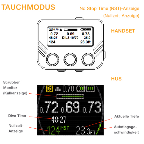 - Rebreatherstatus in Sichtweite - während des gesamten Tauchgangs