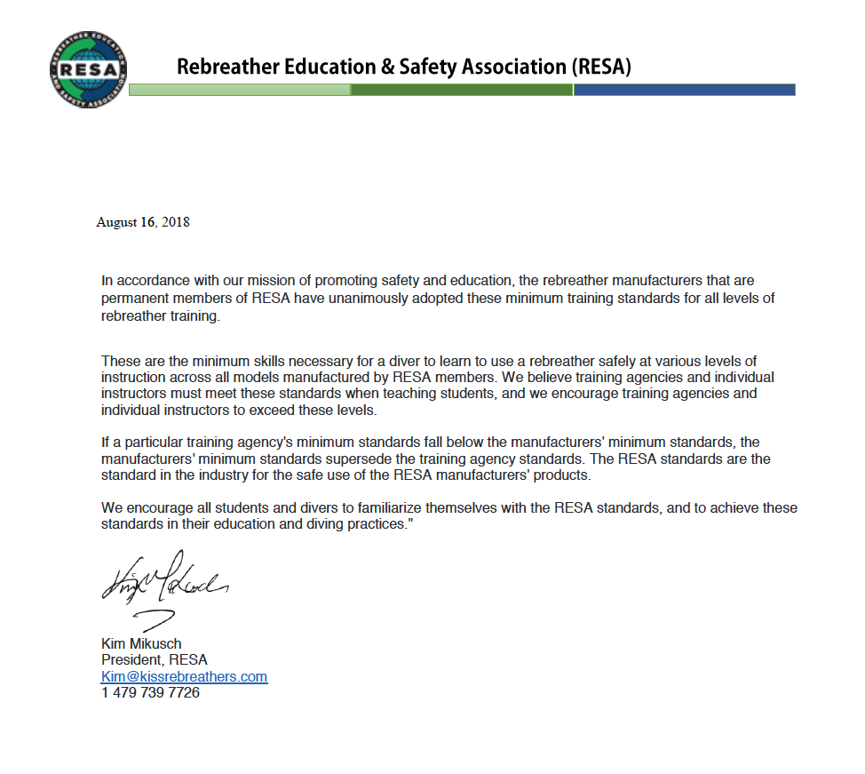 The Rebreather Education and Safety Association (RESA) publish rules on the minimum training standards for rebreather courses…