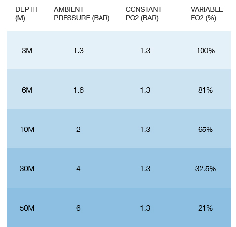 With APD CCRs it is the opposite case: the PO2 is held constant (at a Setpoint) by the rebreather controller and consequently the mix or fraction (FO2) of oxygen is variable as the diver changes depth. How so? Read on...
