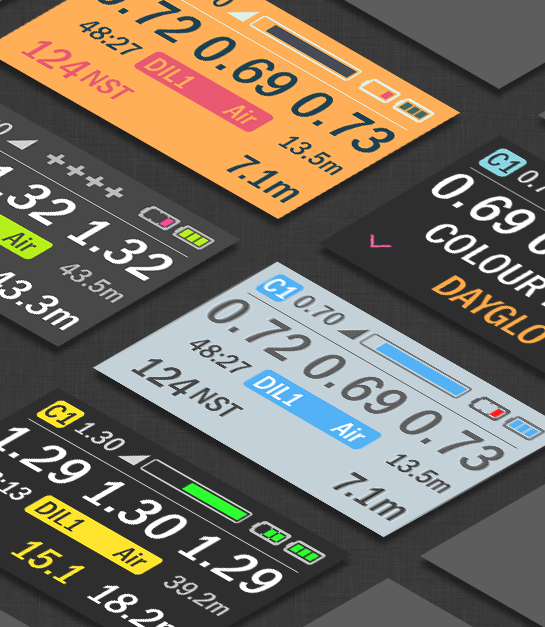 The Colour Theme Designer allows the diver to create unique themes to suit individual preference, colour perception or dive conditions. Safe-guarding limitations are built-in to prevent low contrast choices but otherwise there is plenty of scope to experiment, upload and save up to 2 Custom themes for selection at start-up.