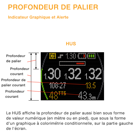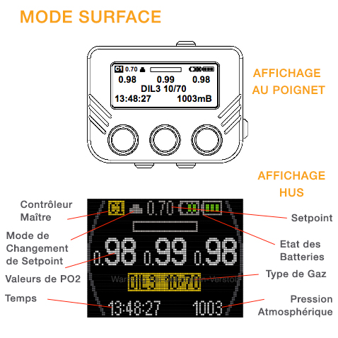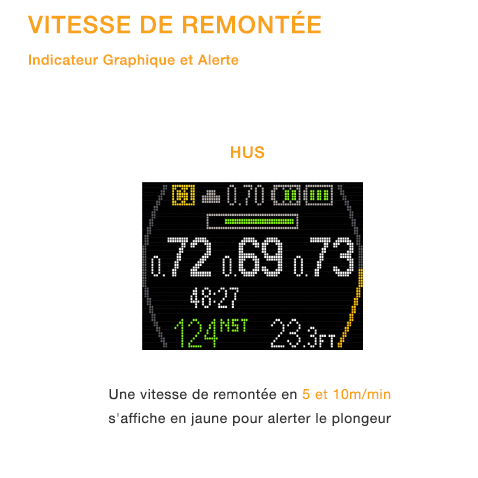 Le HUS AP ou Ecran Tête Haute, est un affichage secondaire mains libres, proche des yeux, affichant les informations de la plongée et du recycleur directement depuis les contrôleurs oxygène.