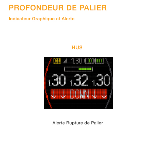 - La Profondeur de Palier passe en Rouge si le palier reste interrompu et l'Heure Estimée de Sortie est affichée