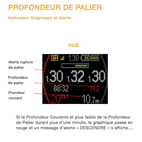 - En cas de palier, des alertes telles que « Durée Totale de Remontée » (DTR) et « Plafond du Palier » sont affichées en jaune