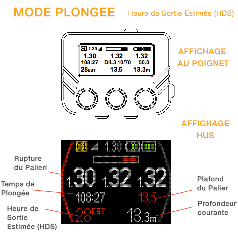 - Si le palier est interrompu durant plus d'une minute (remontée involontaire), «l'Heure de Sortie Estimée» et « Plafond de Palier » sont affichés en rouge