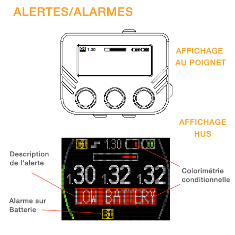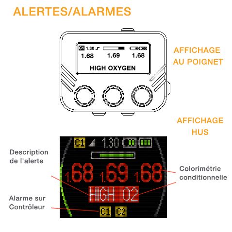 Colorimétrie conditionnelle du texte et des graphiques pour permettre une lecture claire et intuitive des informations du recycleur, ainsi que des différentes alertes et alarmes.